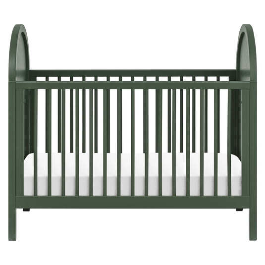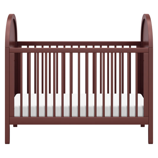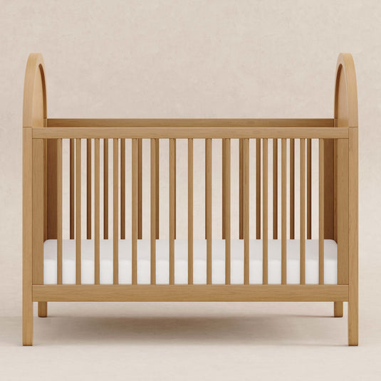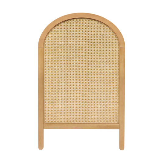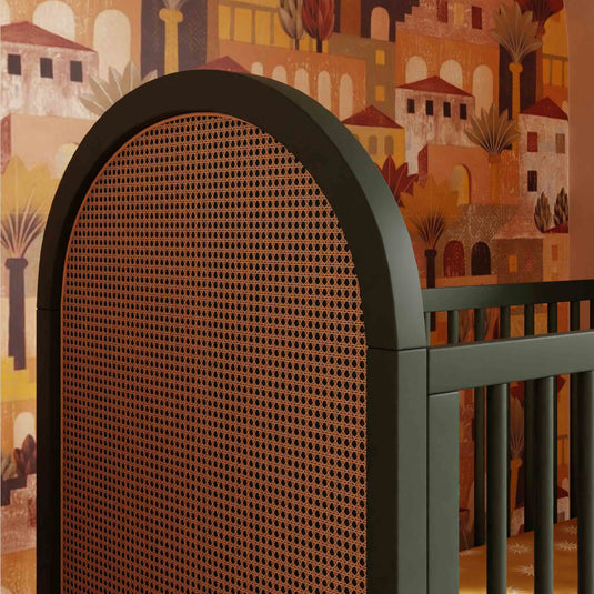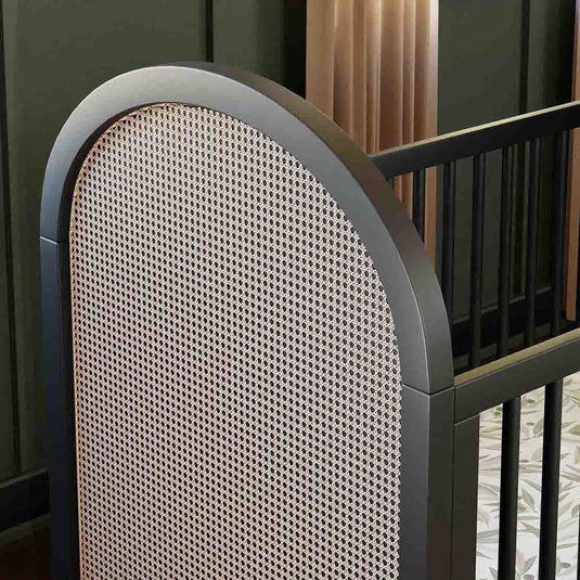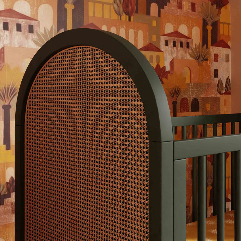 The Bondi Cane 3-in-1 Convertible Crib celebrates boho-inspired design and natural materials with its warm wood tone, playfully arched side panels, curved feet, and woven plant-based cane. The Bondi is designed to grow with your babe using an included toddler bed conversion rail and is screened for harmful chemical emissions to ensure it meets GREENGUARD GOLD Certification.