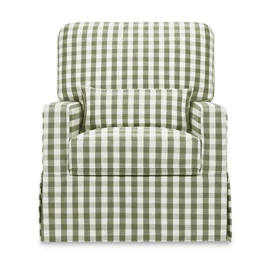 The Crawford Glider offers a modern take on traditional slipcover style and brings nursery comfort to a new level with its plush pillowback design, added lumbar pillow, and wide seat. Its smooth, back-and-forth gliding motion helps you rock your baby to sleep with ease, while the convenient swivel creates an inviting repose for both you and your baby.