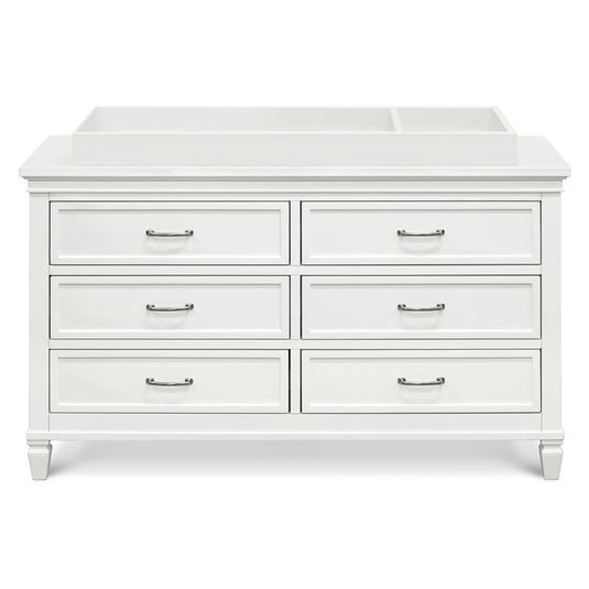 Bring the elegance of romantic French country inspired style into the home with the Darlington 6-Drawer Dresser. The dresser balances classic raised molding on six drawer fronts, delicate tapered feet, and accent satin nickel drawer handles. All spacious drawers feature dovetail construction with self-closing, ball-bearing drawer glides. Available in a Warm White finish.