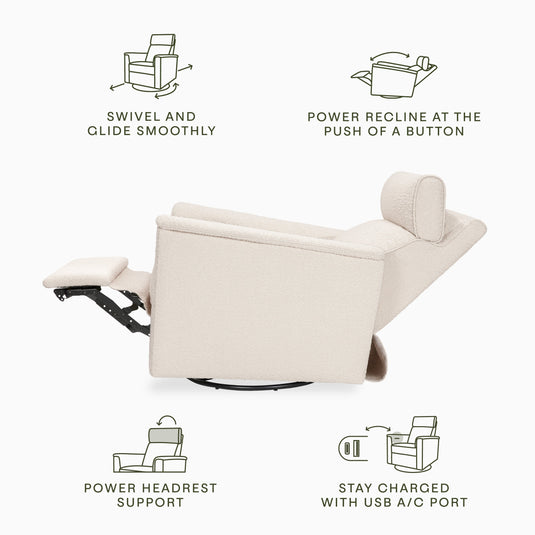 A deluxe, electronic version of our best-selling Willa Recliner. With thoughtful details and clean lines, the Willa Plus Power Glider Recliner w/ Power Headrest combines modern design with traditional comfort. Its pillow lined arms, smooth glide, and power recline + power headrest create the most comfortable and luxurious resting spot for you and your baby.